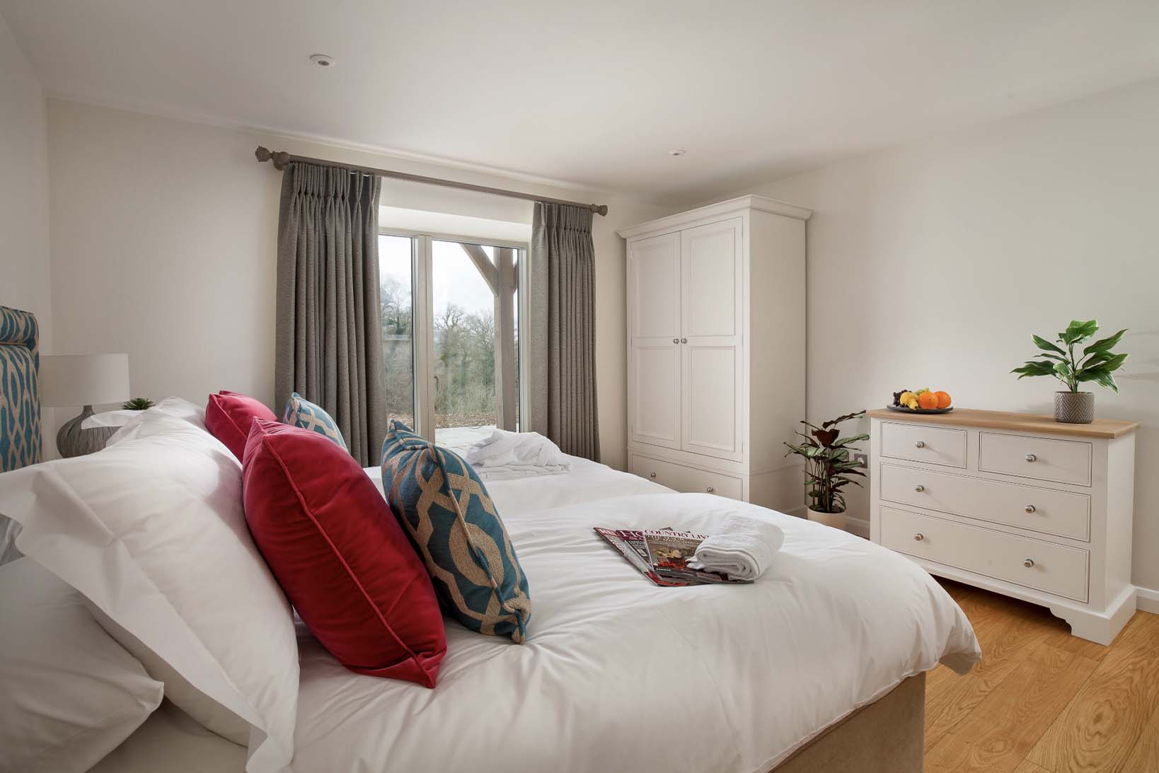 Light and spacious room with the character of the oak frame continuing through the building from the main living area. The room has a luxury accessible en-suite that has been carefully designed to offer the guest ease of access whilst affording them the level of detail and design offered in the other designer bathrooms. It has a double bed and benefits from having an opening door on the outside parking area letting.